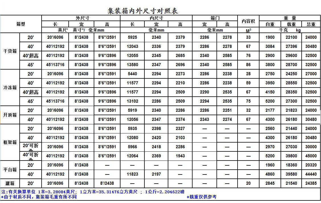 集装箱内部的最大长、宽、高尺寸。高度为箱底板面至箱顶板最下面的距离,宽度为两内侧衬板之间的距离,长度为箱门内侧板量至端壁内衬板之间的距离。它决定 集装箱内容积和箱内货物的最大尺寸。